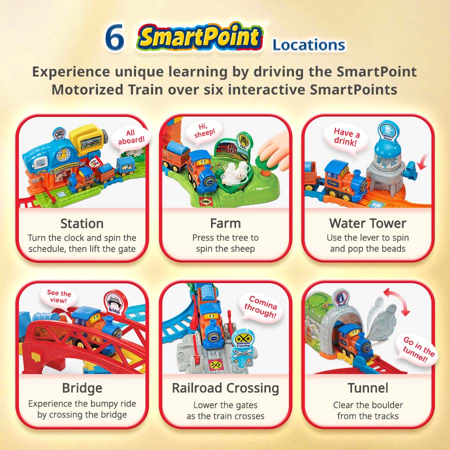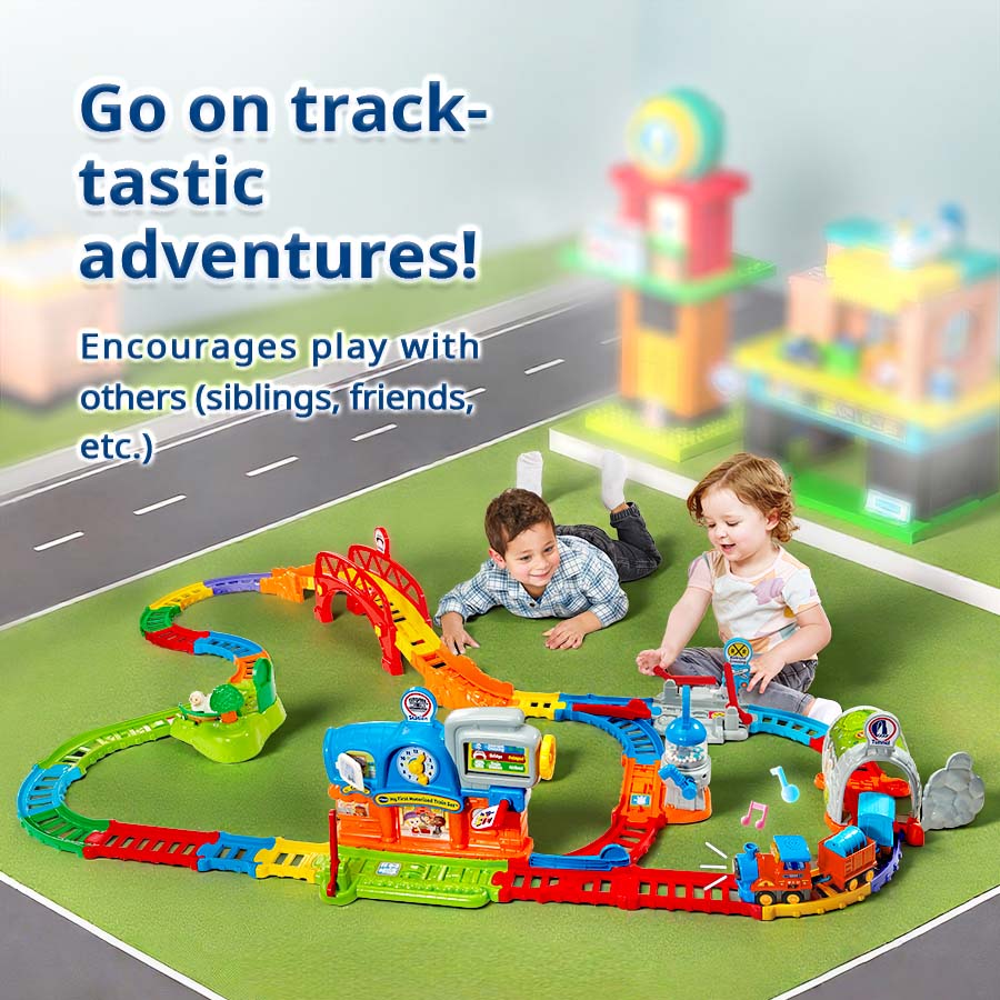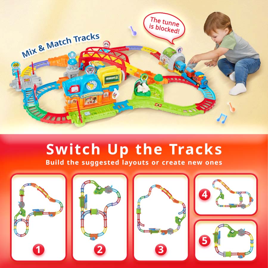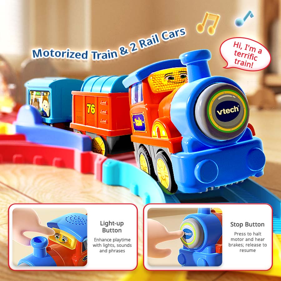- 請上車!小朋友可以喺互動感應嘅電動火車上選擇三種學習模式,帶住兩節貨卡沿五米長軌道出發