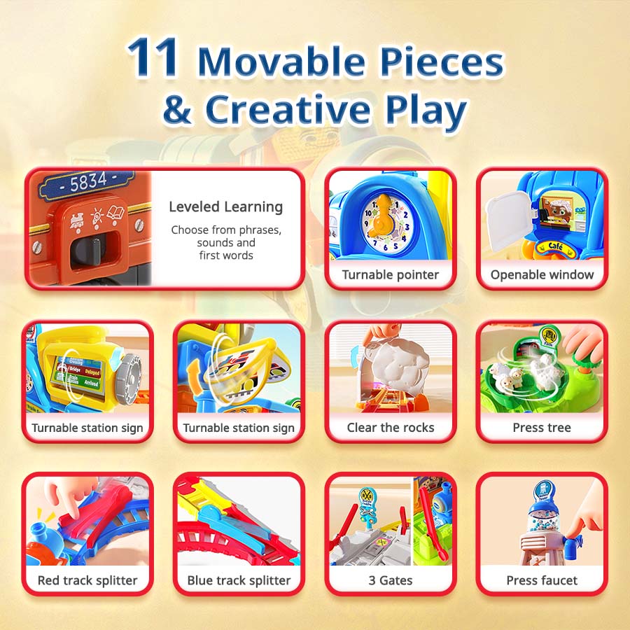 - 轉動車站班次表、設定時鐘、旋轉農場綿羊、撥動水塔波珠,仲有總共11件幼兒操作部件等你探索