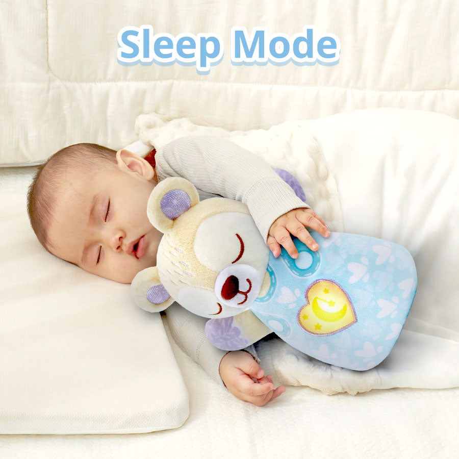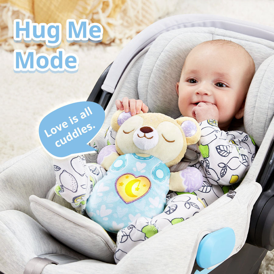 - Cuddly, soft fabric bear plays white noise, nature sounds and a calming heartbeat