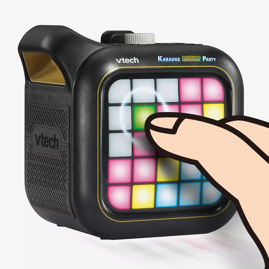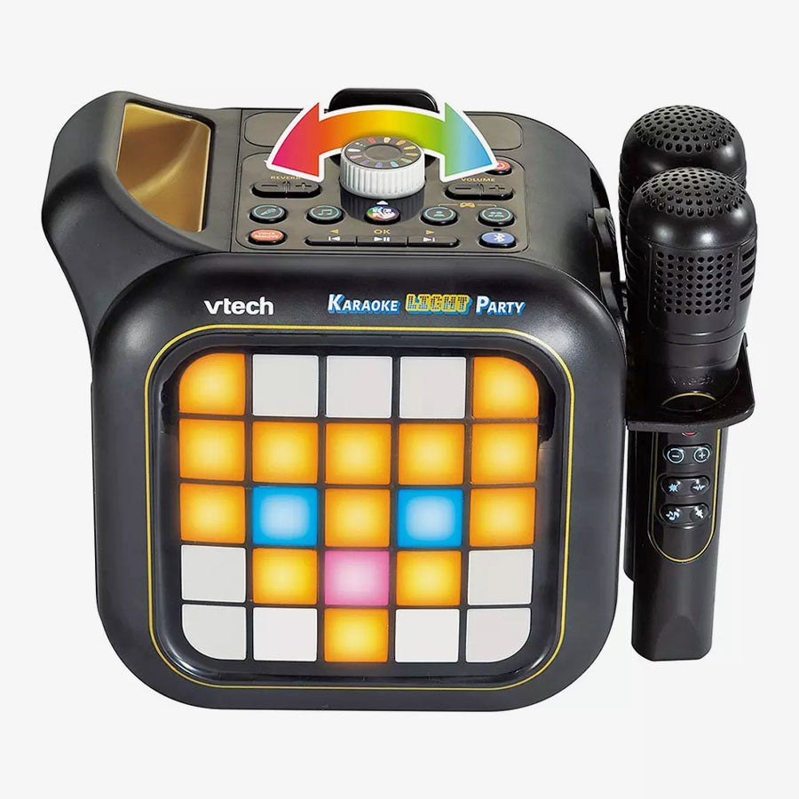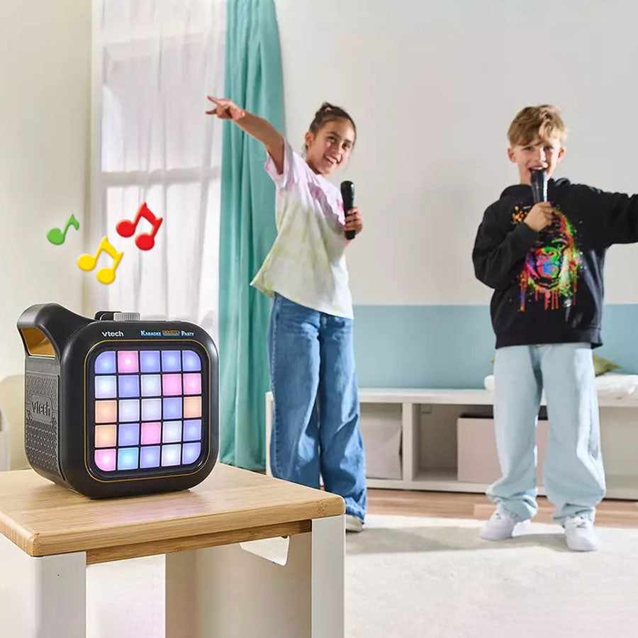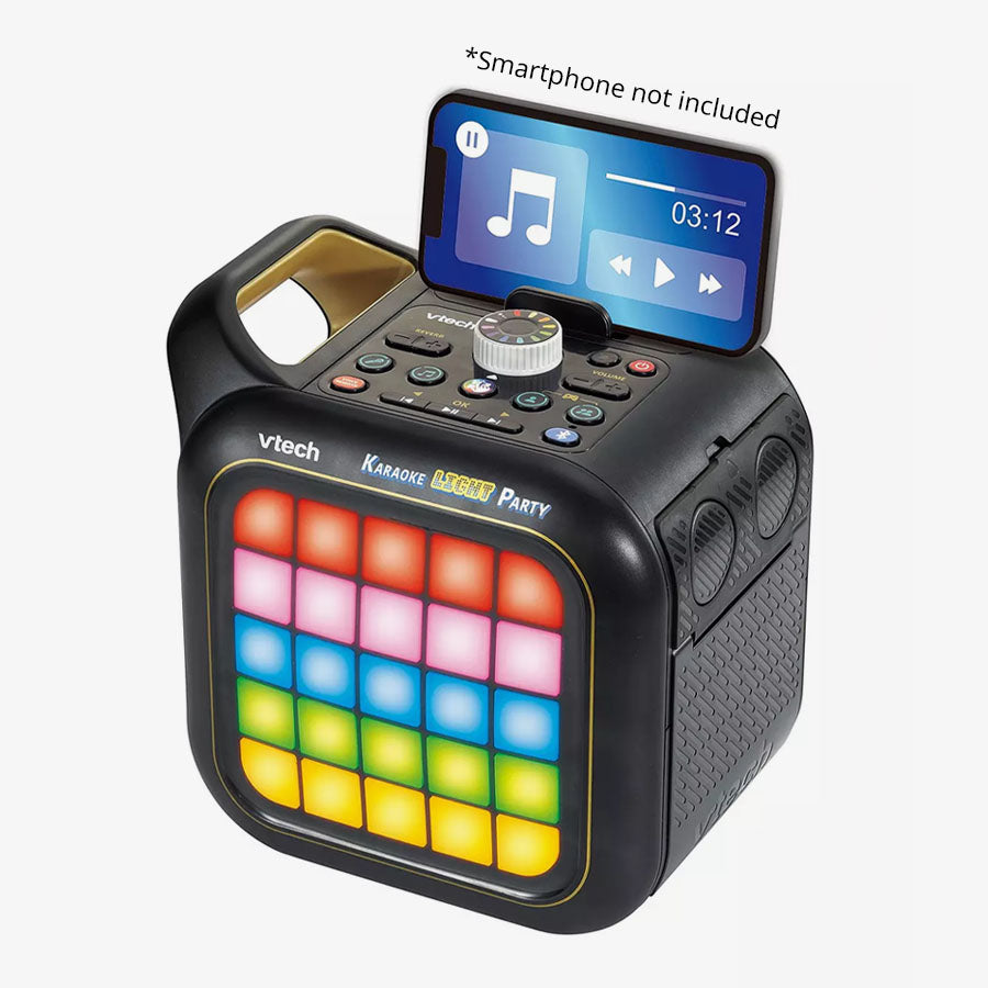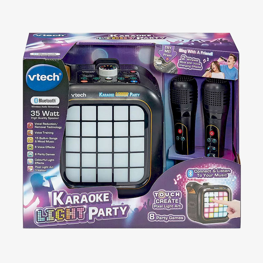 Connect and listen to your music with the Karaoke Light Party by VTech. This cool, portable, multifunctional Bluetooth® speaker features two wireless microphones. Use the microphones to sing your favourite songs, or sing along to the built-in songs and add fun voice effects to your voice! There are 8 exciting built-in games for 1 or 2 players available for practising and enhancing your singing skills, and other games such as a version of the retro game, Snakes! On the front of the speaker there are 25 pixel buttons. Turn the colour dial and press each pixel button to create up to 10 unique pixel arts and watch how they dance along to the music! In music mode set the lights to play and create a relaxing light display, or fun lights fit for a party! Make every Karaoke party, a Karaoke Light Party!