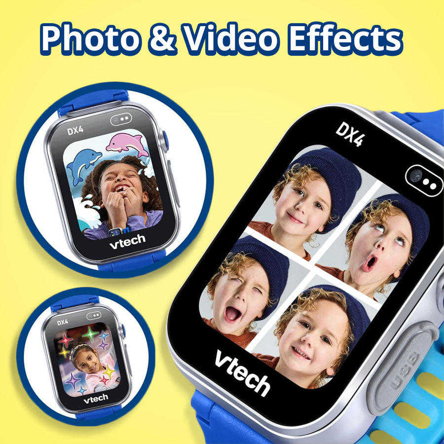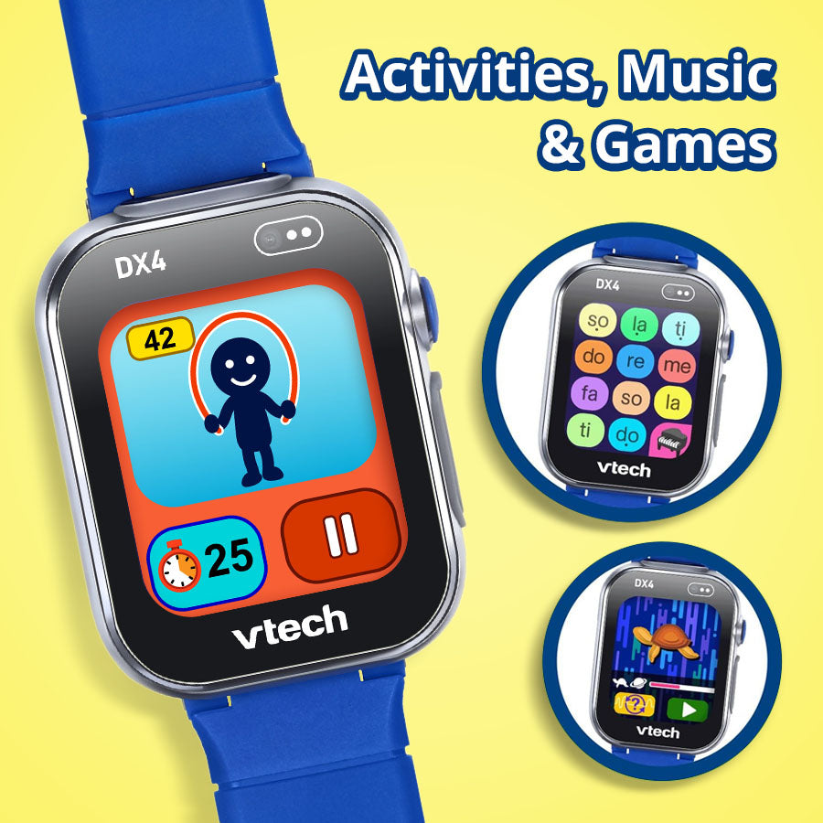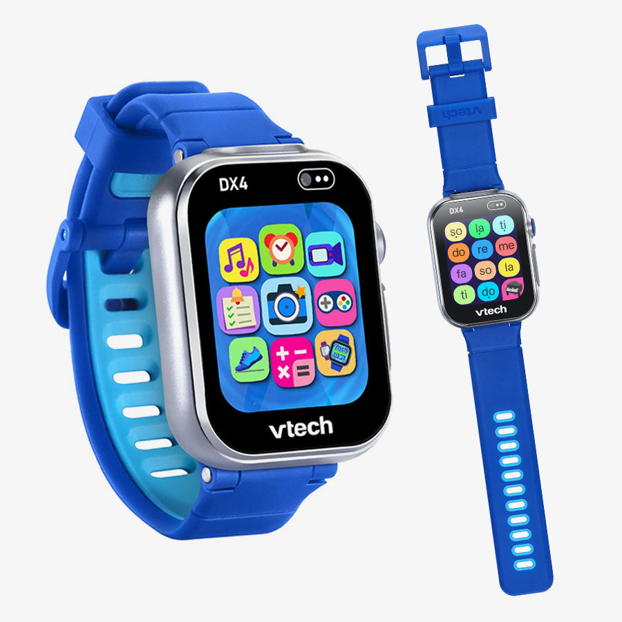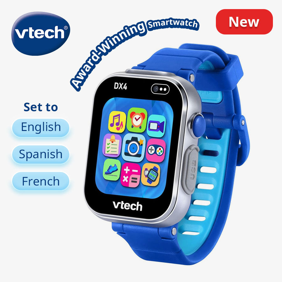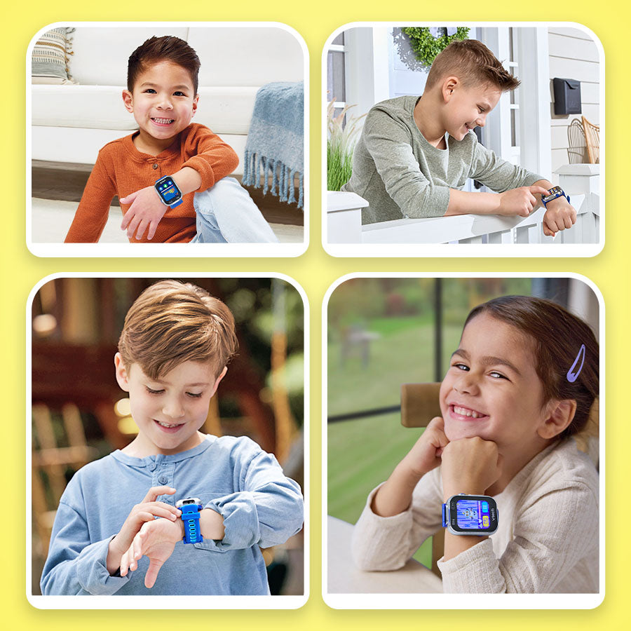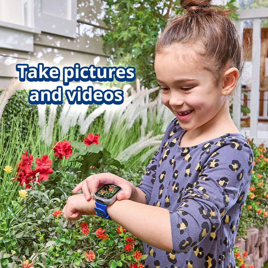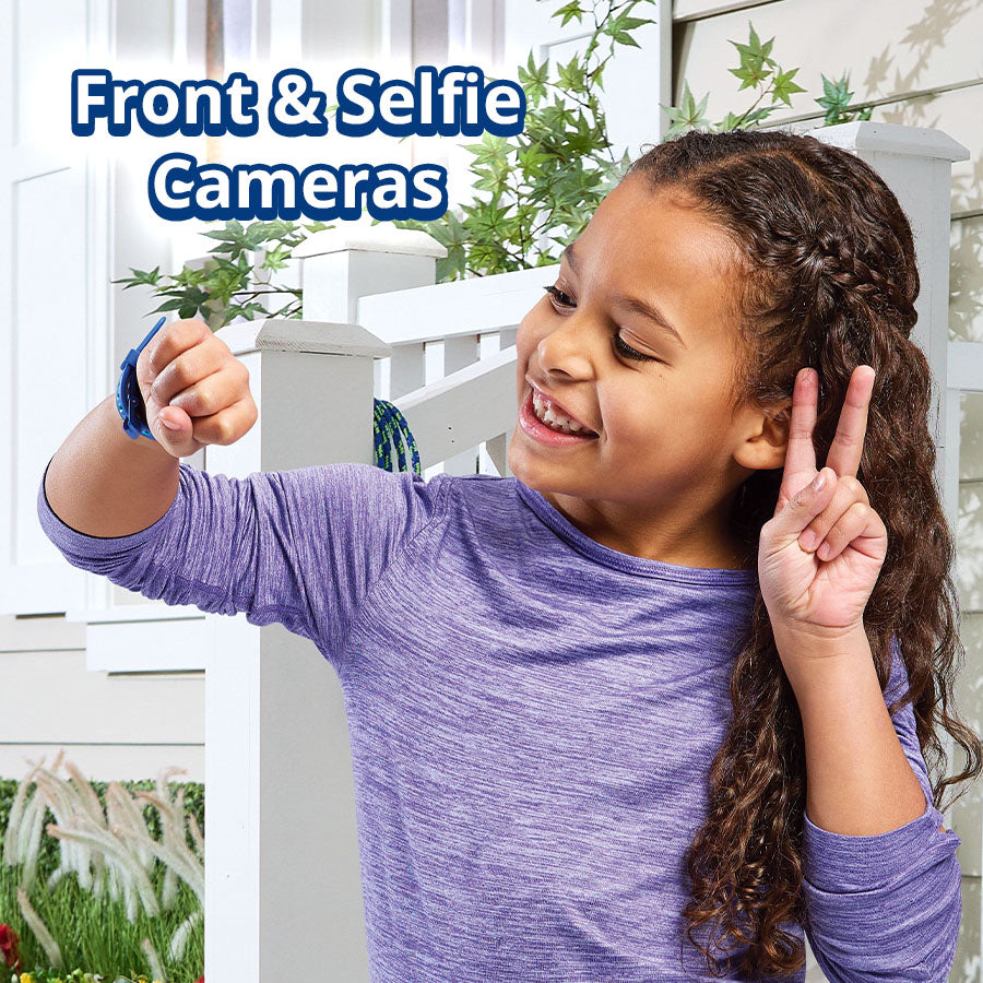 Strike a pose! This smartwatch features two cameras, a high-resolution screen, a splash-proof metal body and a fashionable watchband that makes this full-function smartwatch the coolest tech around. Get creative with the dual cameras to personalize your clock face, photos and videos with the effects and filters. Find AR monsters in the real world, compose music using instruments and sound effects, and play exciting movement games to see your step count soar. Practice telling time with over 50 clock faces or shake the watch to hear the time out loud. Download additional games and more from the Learning Lodge. Set to English, Spanish or French.