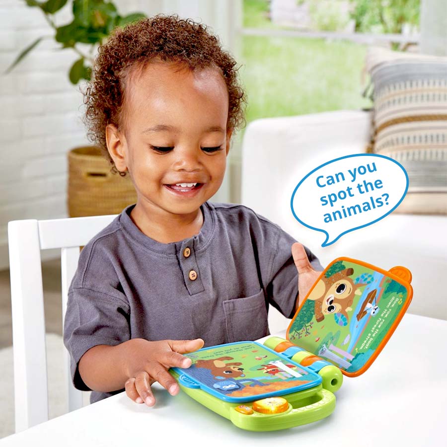 - Travel through four pages with textured tabs to help little ones work on fine motor skills as they flip