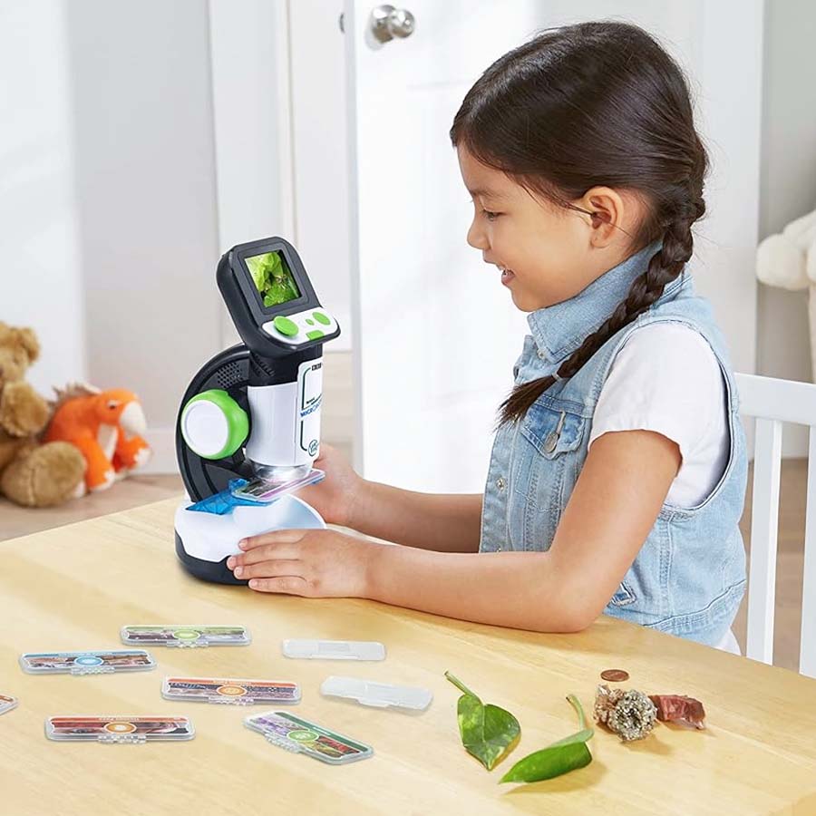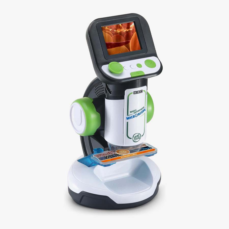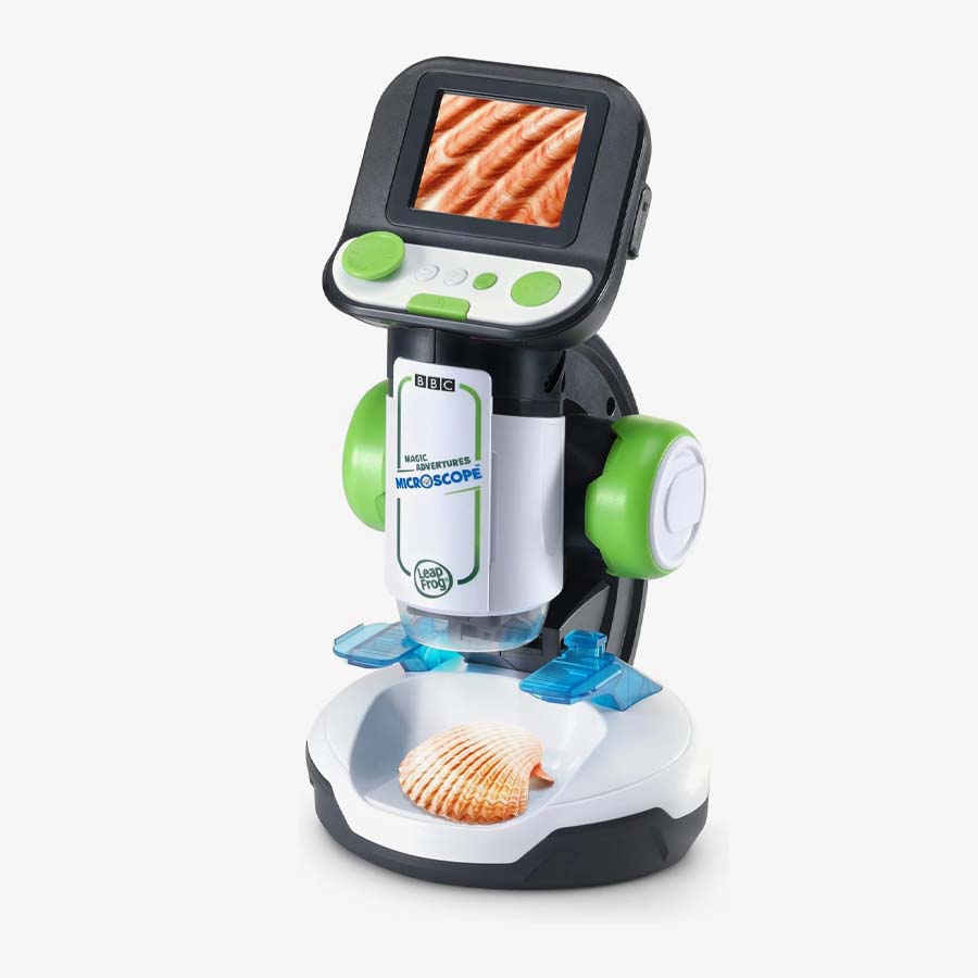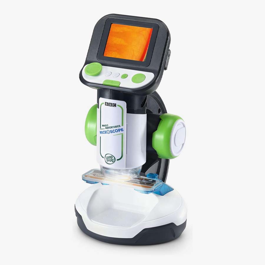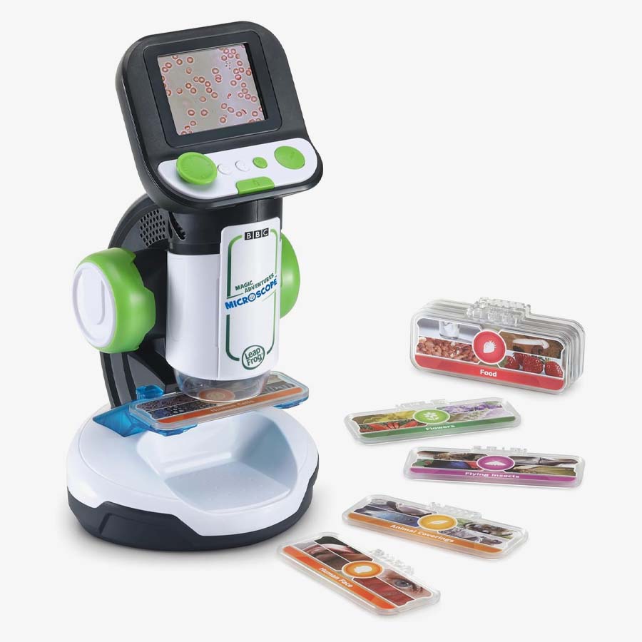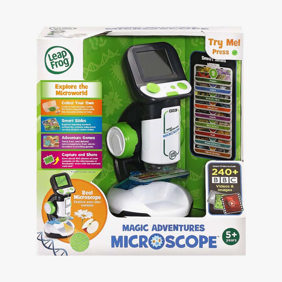 Explore tiny worlds full of huge discoveries with the Magic Adventures Microscope™. Young biologists can zoom in on flowers, animals, food, minerals and more using eight double-sided smart slides that activate amazing BBC videos and images. Discover answers to curious questions like: How do leaves changes colors? What do plant cells look like? What is sand made of anyway? Make your own discoveries by finding things around the house and getting a closer look using the reusable slides or large sample tray. You’ll be amazed what you can see with up to 200x magnification on this real microscope. See something incredible? Capture and save the on-screen images. Game time! Defend microorganisms from micro-invaders or put your skills to the test with the What’s This? quiz.