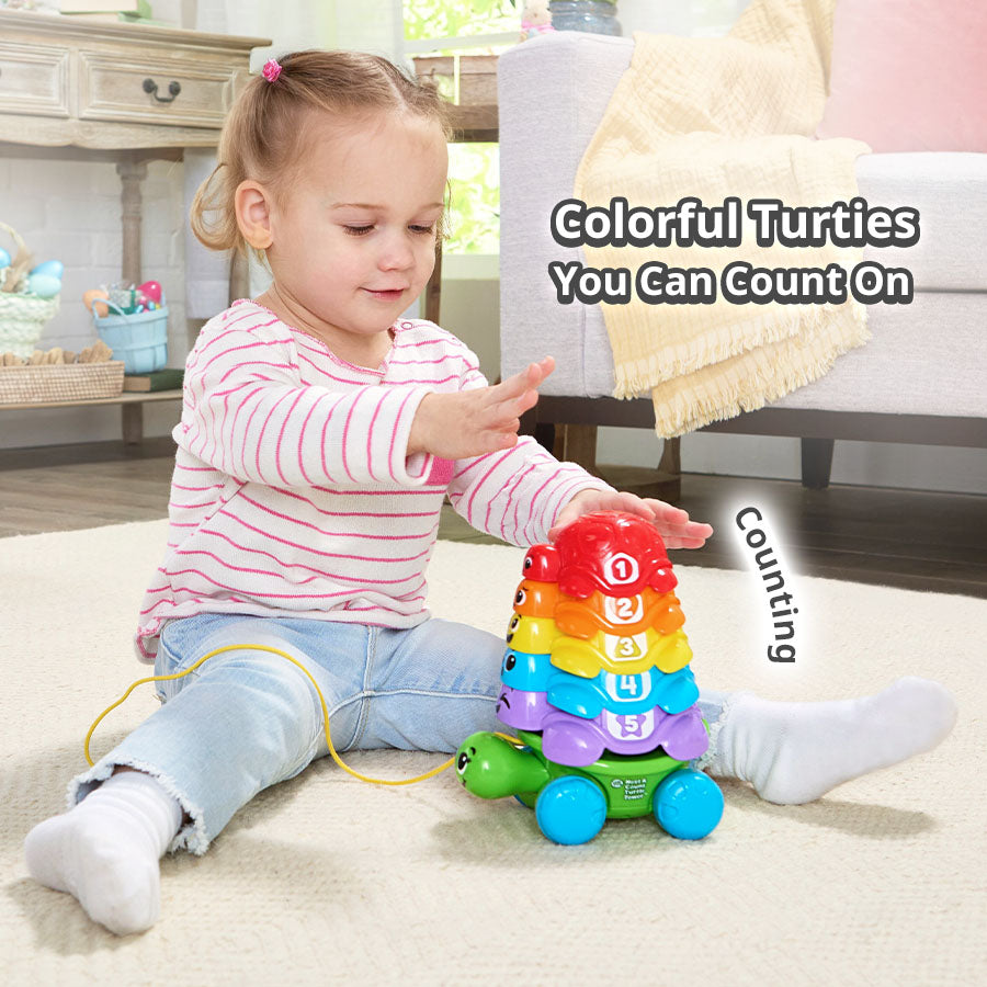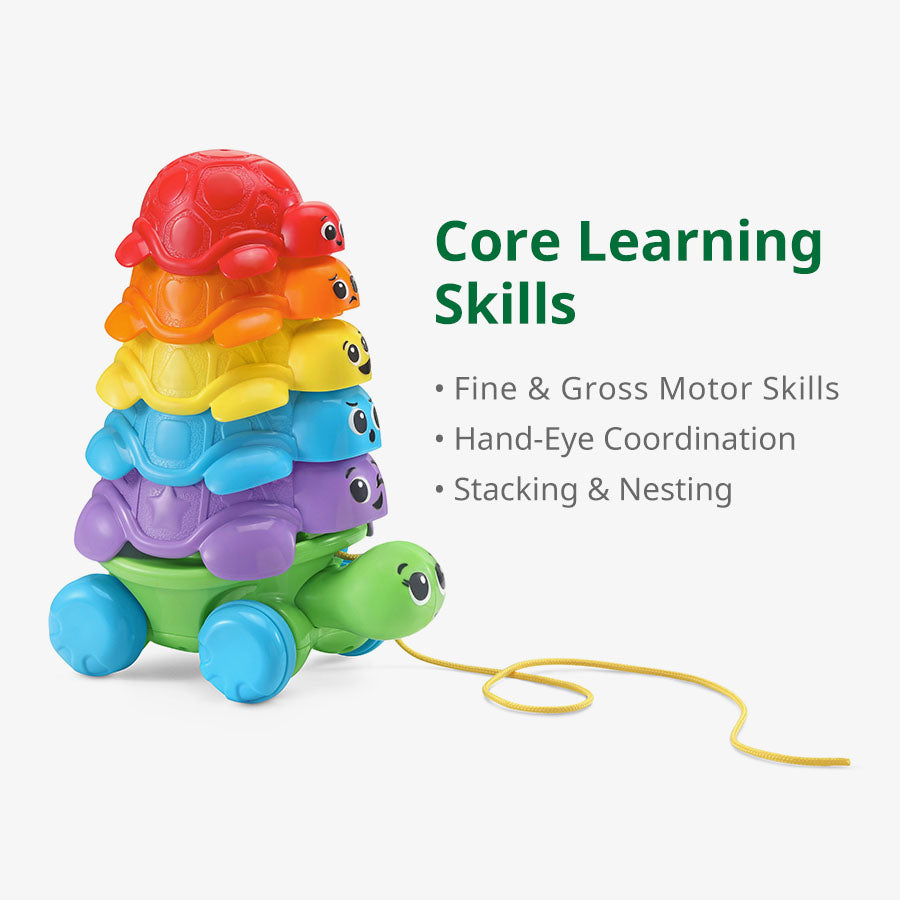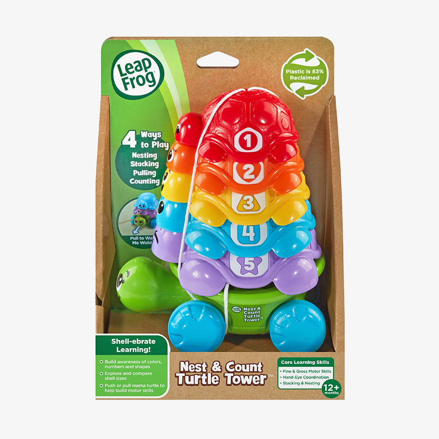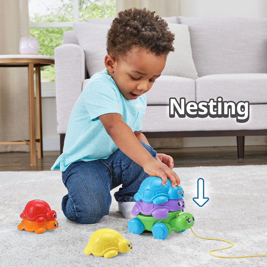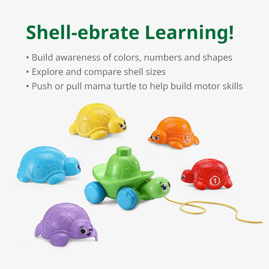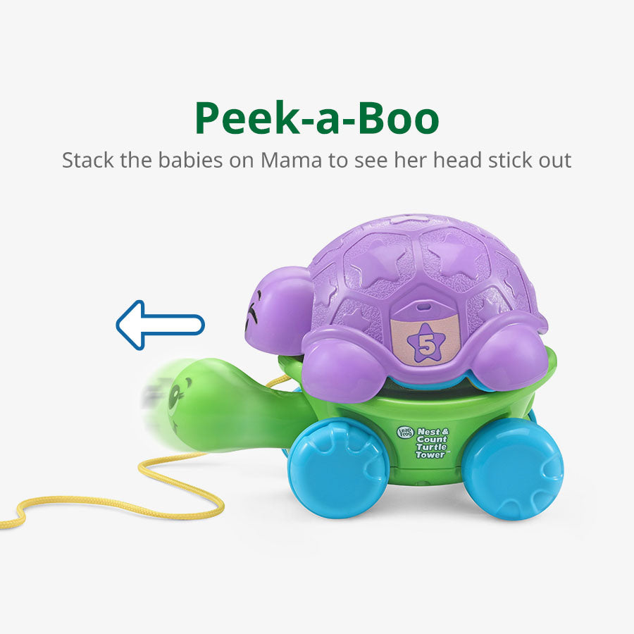 Count and nest the five baby turtles inside each other or stack them on top of the mama turtle. Use the cord to pull them along and see the mama turtle’s head stick out as she wobbles along.
