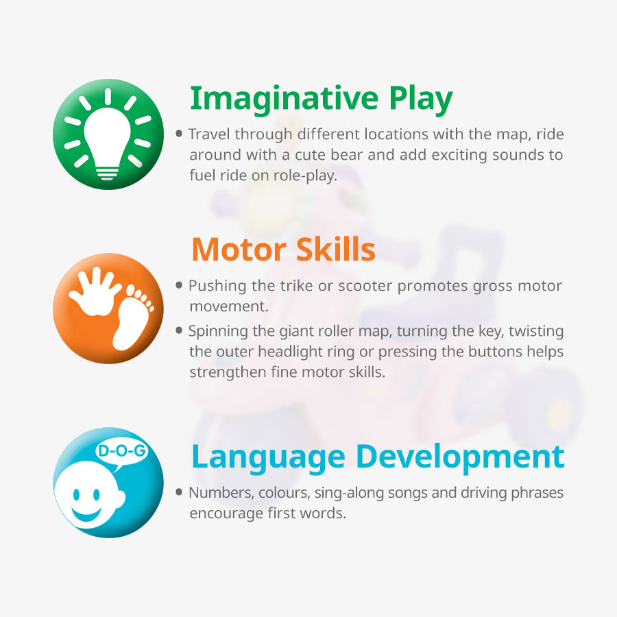 - GPS map roller turns to reveal 4 different locations where toddlers can "drive" to enhance imaginative play