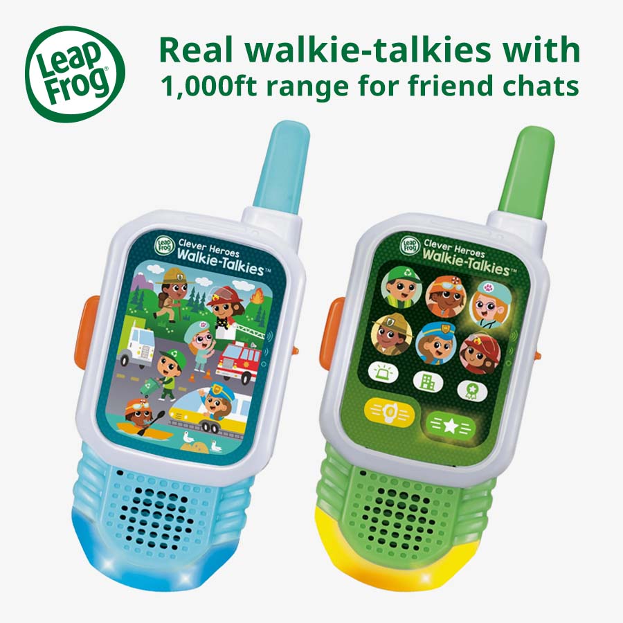 Learn about the hard-working heroes that help us everyday with these Clever Heroes Walkie Talkies! Get to know 6 different hero characters by listening and responding to their requests. Find out how you can be a hero at home! With so much interactive role play content, these Walkie Talkie's are super fun to play with alone, and are great for building confidence in communication. Press and hold the side button to talk, with light effects that react to sound. These high quality walkie talkies will work with a range up to 1000ft, allowing you to explore and chat far and wide!