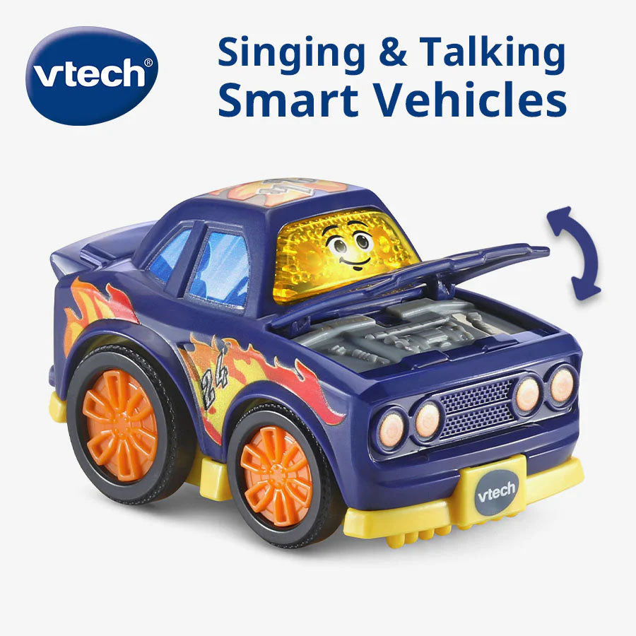 Ready, set, go, go! The talking Go! Go! Smart Wheels® Revved Up Race Car drives imagination and development as it races to break the record. This lightning-fast race car for kids explores first words, feelings and how to calm down. Hear sounds, songs and phrases when you press the windshield, then see the car's face light up. Friendly phrases encourage kids to find a quiet spot and count to calm down with numbers one through five. Time to get ready to race! Open and close the hood to hear sound effects and phrases and build motor skills. This car is zoomin'! Revved-up responses drive learning and encourage imaginative play. Collect SmartPoint® cars to explore the SmartPoints in each Go! Go! Smart Wheels® track set (sold separately).