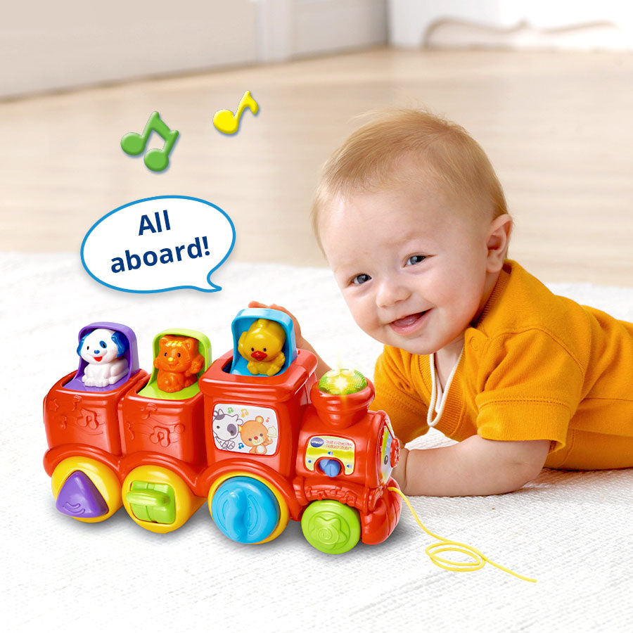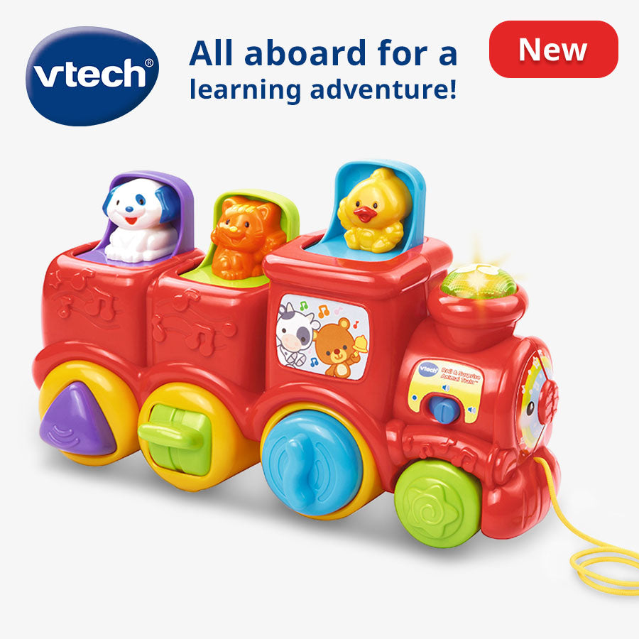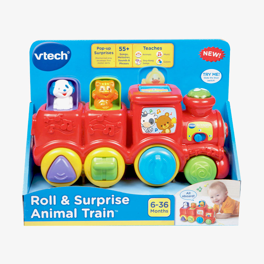All aboard the Roll & Surprise Animal Train™! Join the cute animal friends on an adventure with loads of learning excitement! Your baby will enjoy peek-a-boo play while developing fine motor skills by turning, sliding and pressing mechanical features on the wheels of the train. Pop-up animals introduce animal names, animal sounds and colors. This educational toy also rewards curiosity while teaching cause and effect. The light-up chimney promotes visual awareness as it flashes to 55 songs, melodies, sounds and phrases. Little ones can also build gross motor skills by pushing the train along or using the cord to pull it behind them.
