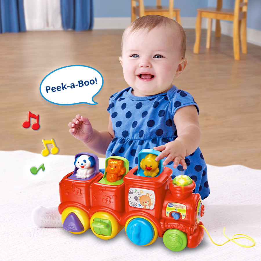 • Peek-a-boo animals reward curiosity with pop-up surprises that teach cause and effect and encourage play