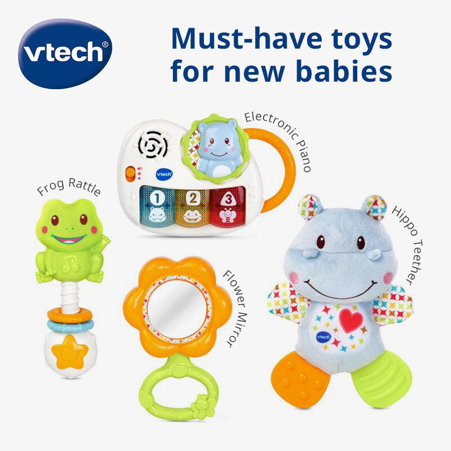 My 1st Gift Set by VTech comes with a soft hippo teether, rattle and piano. Includes 15 popular melodies and 4 sing-along songs and sound effects.