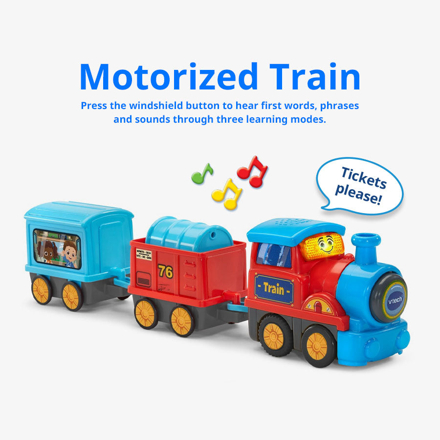 • All aboard! Little engineers can choose from three learning modes on the Motorized Train and take a trip with two rail cars along 16 feet of track
