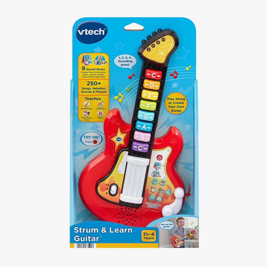 Rock & roll your way to creative play! The more rainbow buttons you press, the more sounds you hear. Move the strings to make your own music or jam along to the built-in melodies. Explore nine different sound styles including electric guitar, animal sounds, silly sounds and more. Bathe in the applause as you build fine motor skills. Adjust the volume for quieter play. Make music, sing along and share your new skills with your adoring fans.