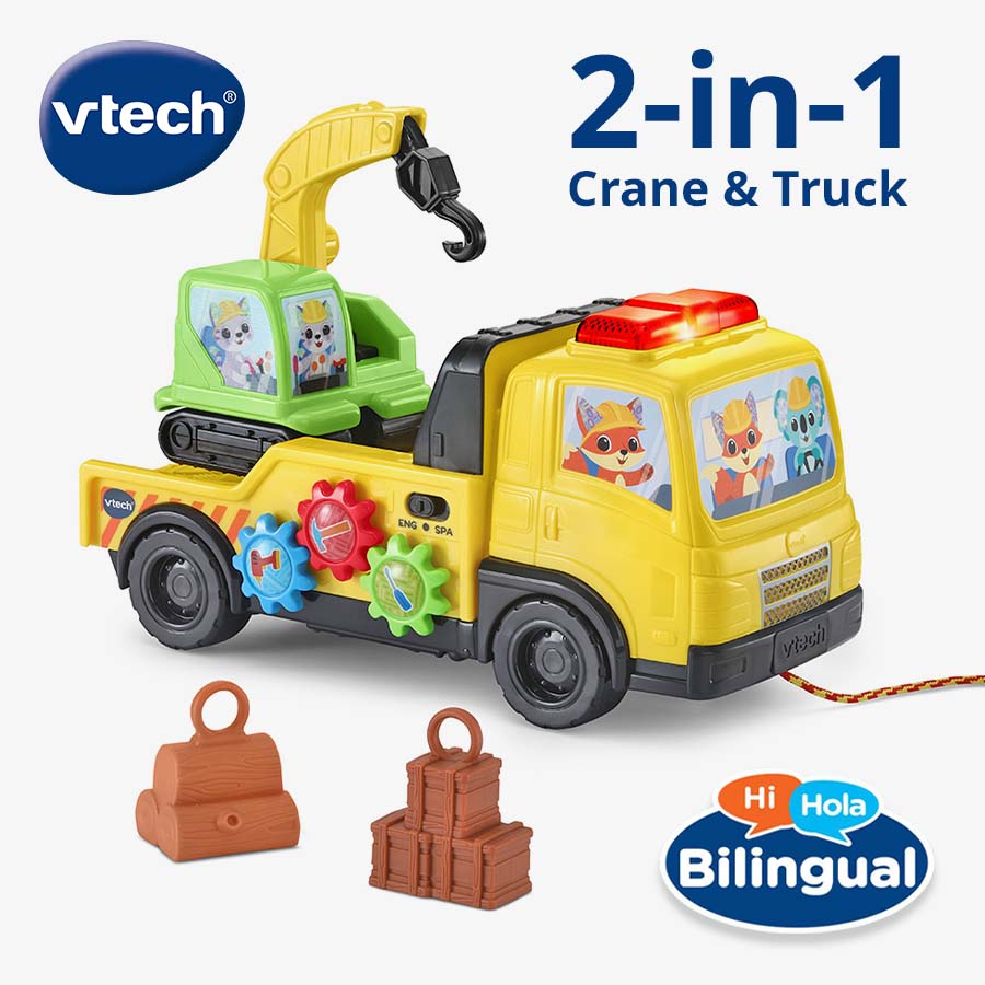 - Get ready for a pull-along construction adventure, using the crane to lift and load cargo while exploring new words in English and Spanish