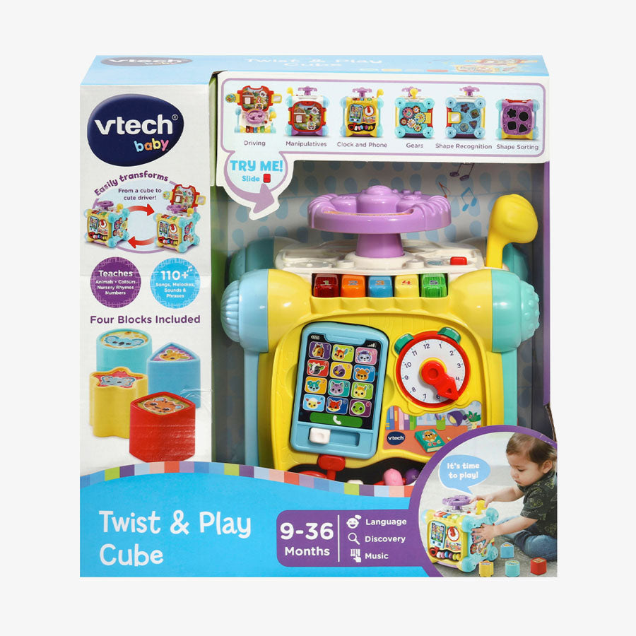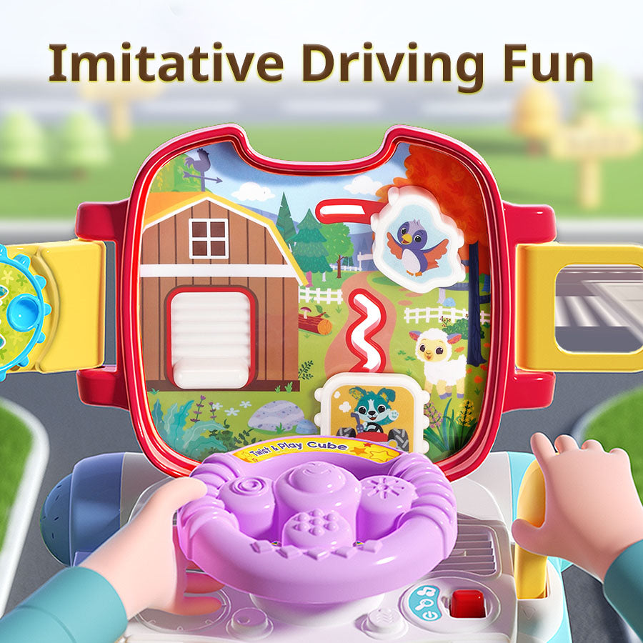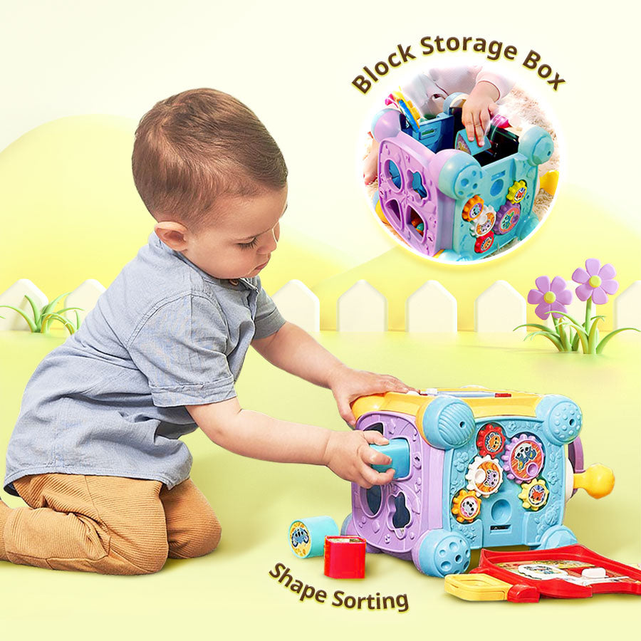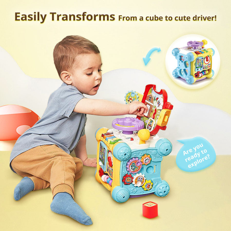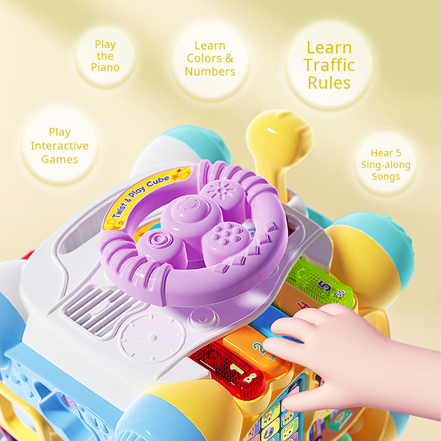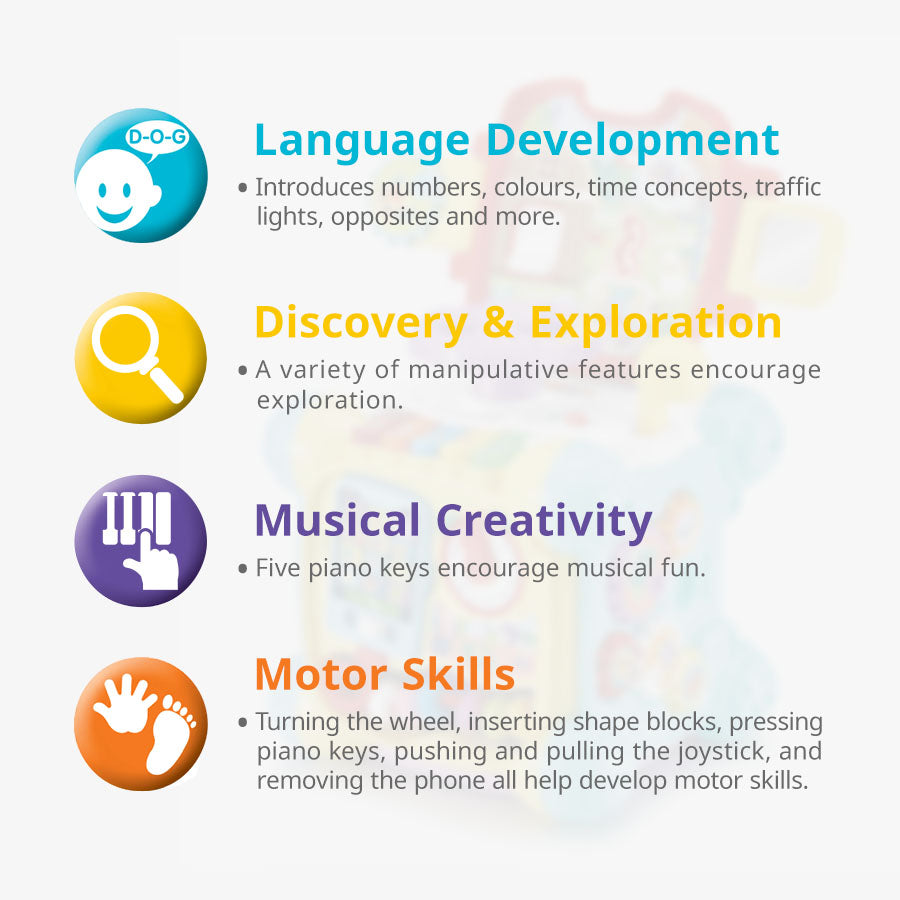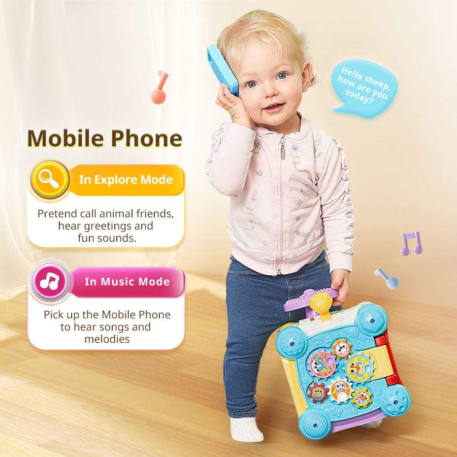 - Piano keys, steering wheel, clock, pretend play phone, gears, beads & a shape sorter enhance baby’s motor skills