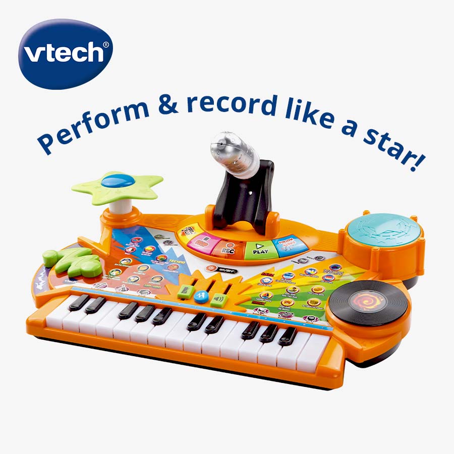 小朋友可以好似搖滾明星噉,用偉易達嘅搖滾電子琴進行表演同錄音。發揮創意探索多種樂器,錄製音樂傑作嗰陣仲可以調校節拍、跟住音樂唱歌,再同親朋好友分享。跟住發光鍵盤嘅燈光學彈鐘意嘅旋律,又或者揀一種樂器用鍵盤彈出唔同音色。按下銅鈸或者敲鼓面加節拍落首歌度,仲可以扮DJ刮碟整音效,加快減慢節拍配合自己風格。呢部搖滾電子琴仲配備真正嘅變聲咪高風,令小朋友可以跟住搖滾、嘻哈、爵士同電子音樂風格嘅 20 首旋律唱歌。