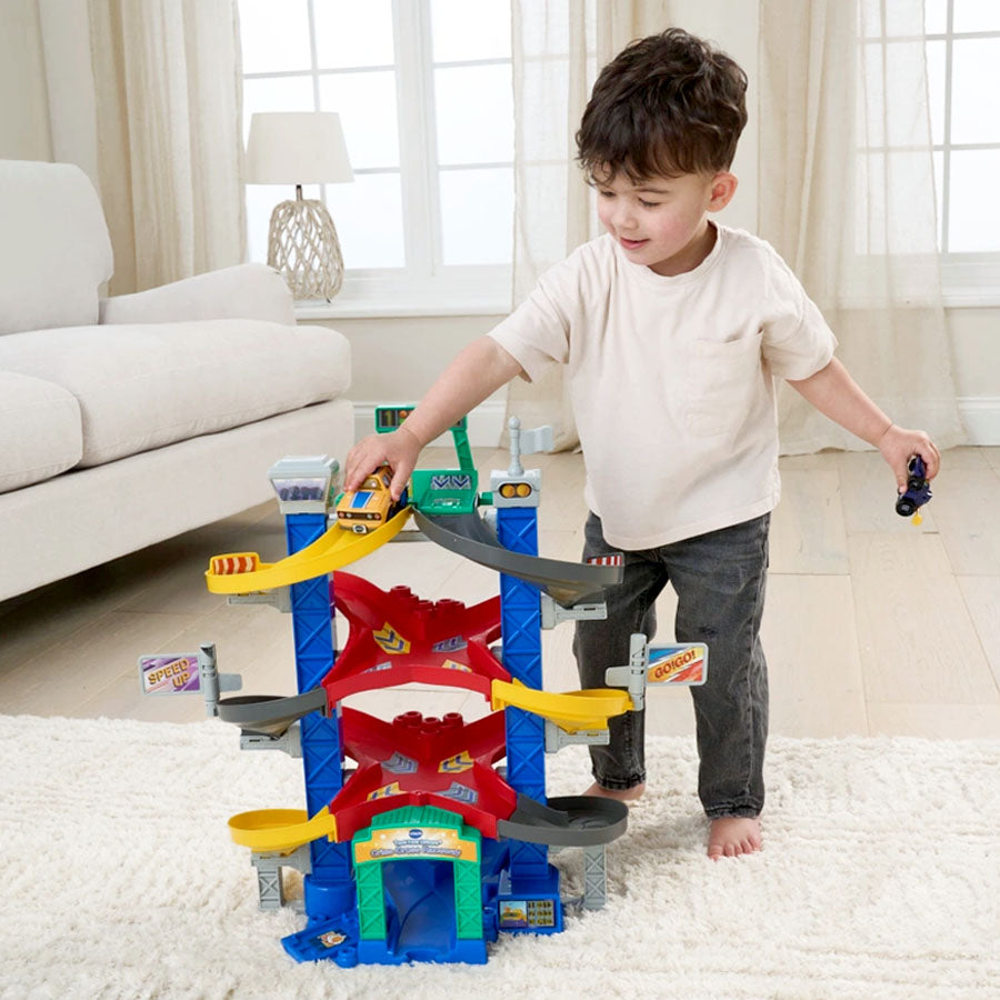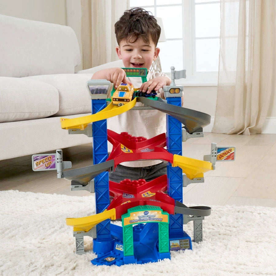 - 互動感應賽車配備發光按鍵,觸發後播放 3 首歌曲、6 個旋律及趣味語音